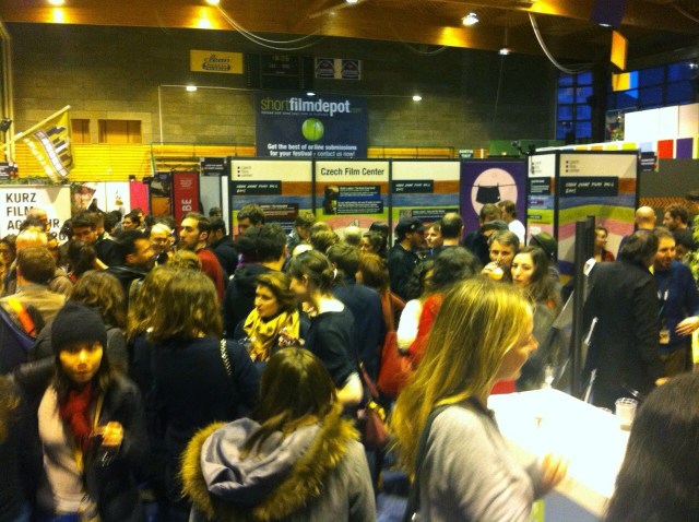 3. El salto espacial es mucho mayor en la parte final de este montaje paralelo. Ahora, se ve a Jonay, coordinador de nuestro departamento de distribución audiovisual, formando parte del mercado del festival de cortometrajes más importante del mundo, el de Clermont-Ferrand. Allí, en la localidad francesa, está toda esta semana como representante del catálogo de cortometrajes Canarias en corto 2013-2014 del Gobierno de Canarias, intercambiando experiencias y trabajos con lo más granado del sector.